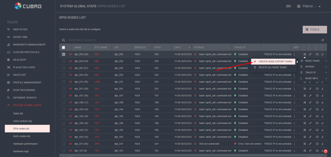 To do this, click the "Create export tasks for node" button to export all tasks to the DPI.