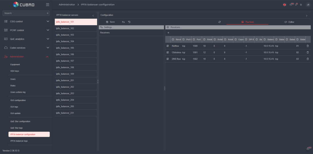 Load-balancer configuration can also be managed via GUI at: Administrator → IPFIX-balancer configuration