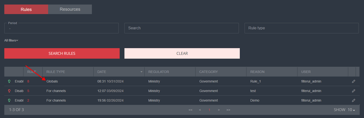 - The Global list is imported into the graphical interface as a rule. Although this rule is not editable, you can view the list of resources it contains.