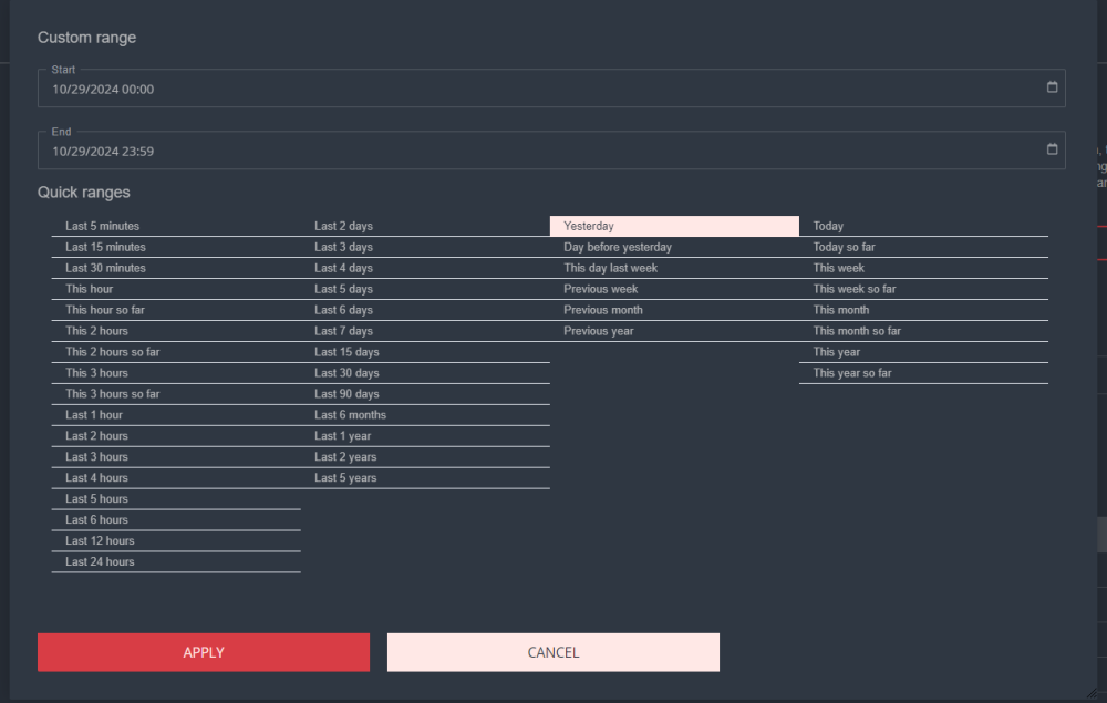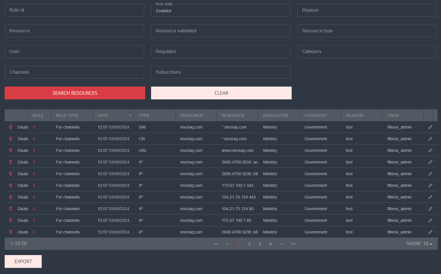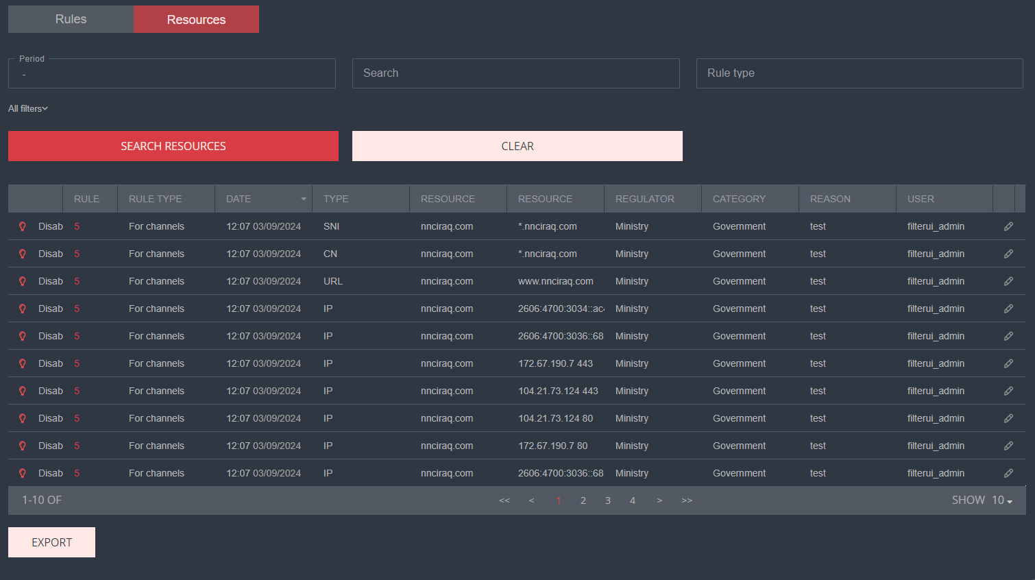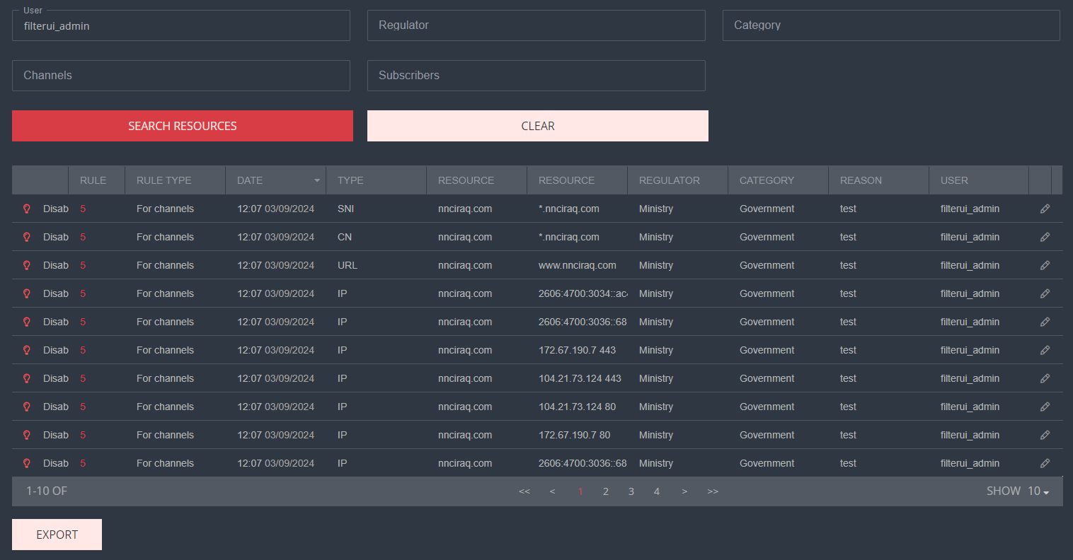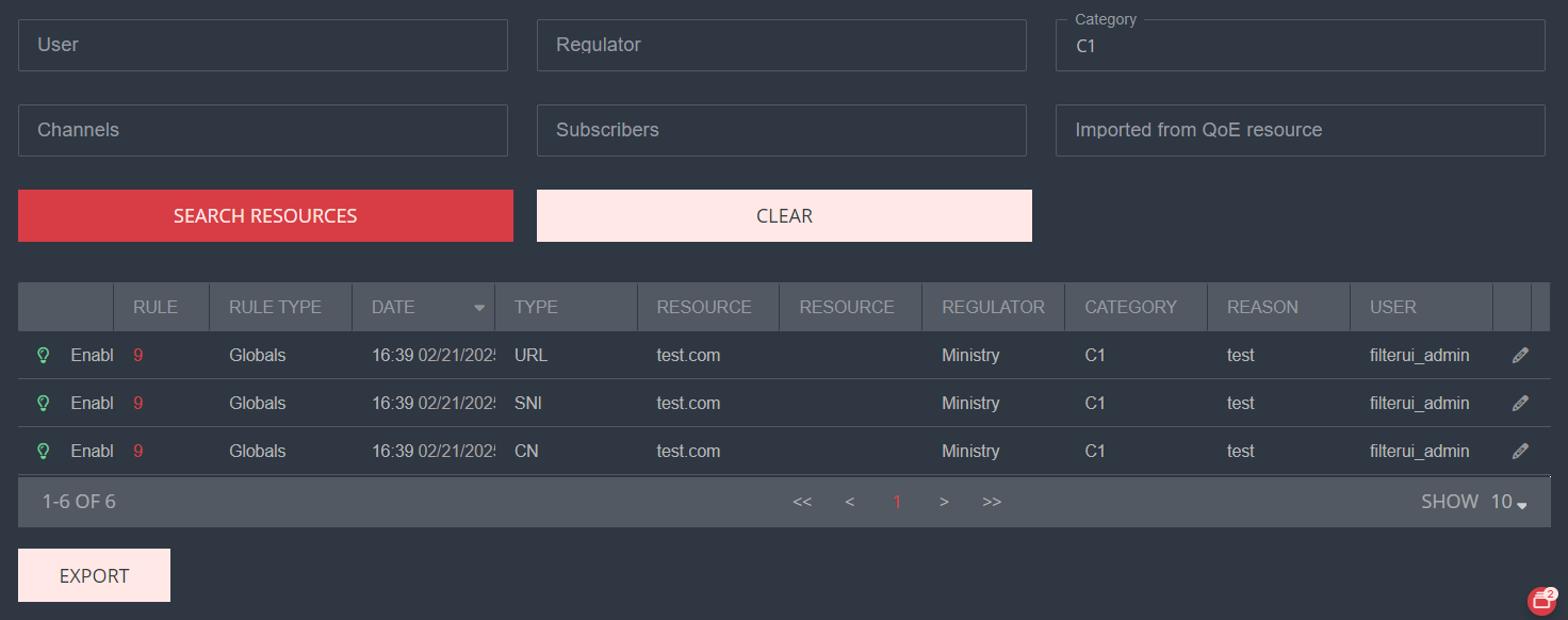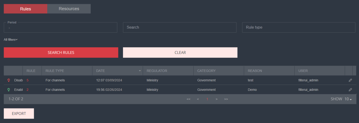 For example, to find a resource added yesterday that has the rule type — Channels, you need to:- After entering all filters, click the Apply button. The table will be filtered based on the specified values.